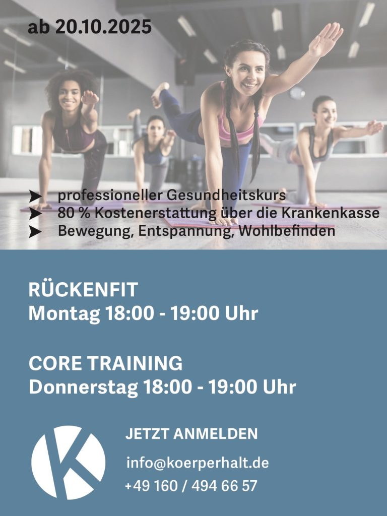 Die Rumpfmuskulatur verbindet Oberkörper, Becken und Beine und spielt eine zentrale Rolle für Haltung, Atmung, Bewegung und Kraftübertragung. In dieser Kursreihe trainieren wir gezielt die Muskulatur von Bauch, Rücken und Beckenboden - "Core". Durch abwechslungsreiche Übungen verbesserst du Deine Haltung, Stabilität und Beweglichkeit.